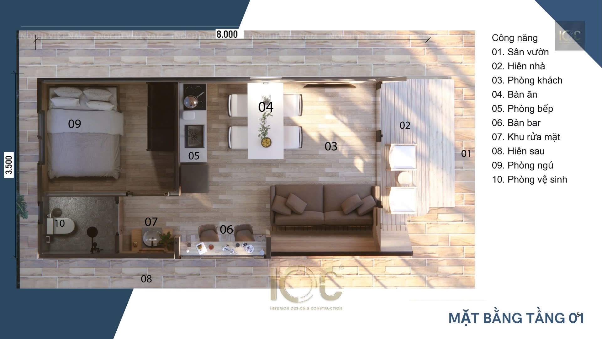 Function: 1 bedroom, 1 bathroom, kitchen combined with living room