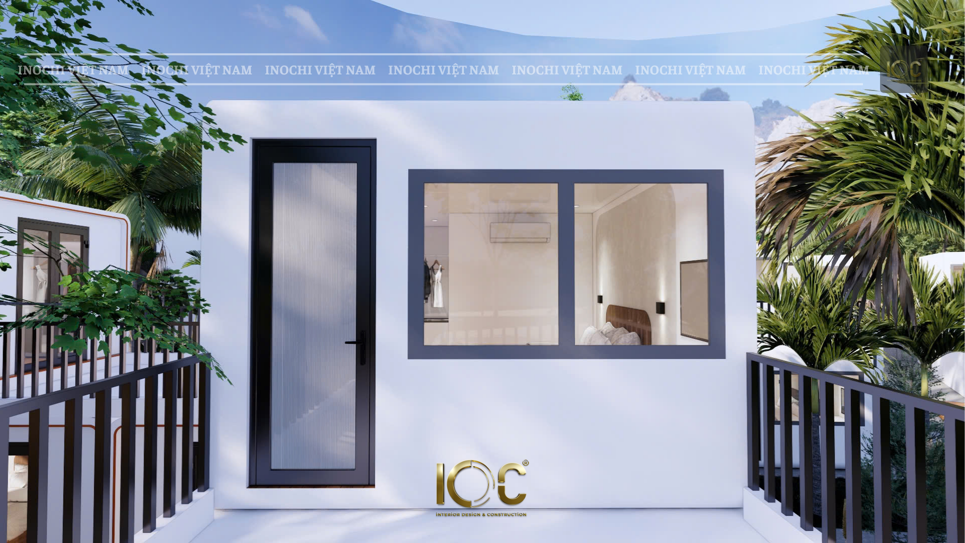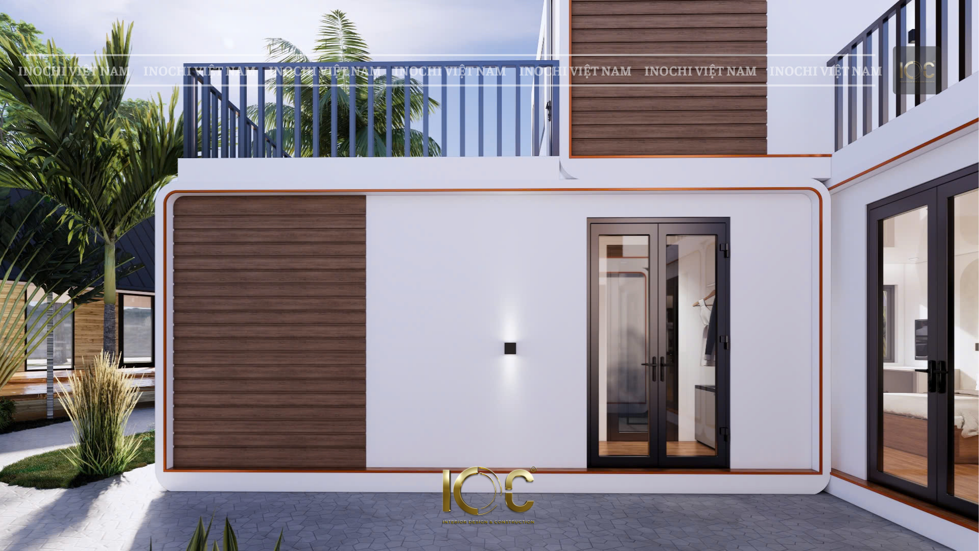 INOCHI VIETNAM introduces a prefabricated house model designed in a modern minimalist style, combining environmentally friendly materials and streamlined architectural lines. The facade uses tempered glass to expand the view towards the sea, along with decorative wooden slats to create depth and a feeling of closeness to nature. Compact area, quick construction, suitable for homestay, resort bungalow or high-class mini apartment.