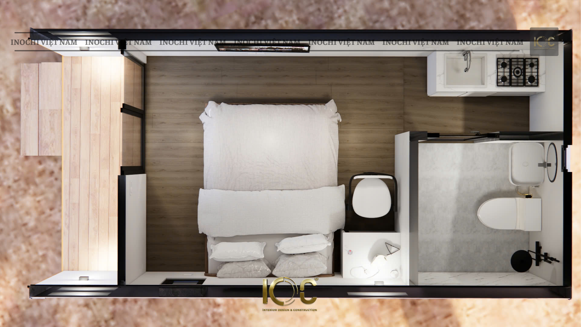 Function: 1 bedroom, 1 bathroom, kitchen combined with living room