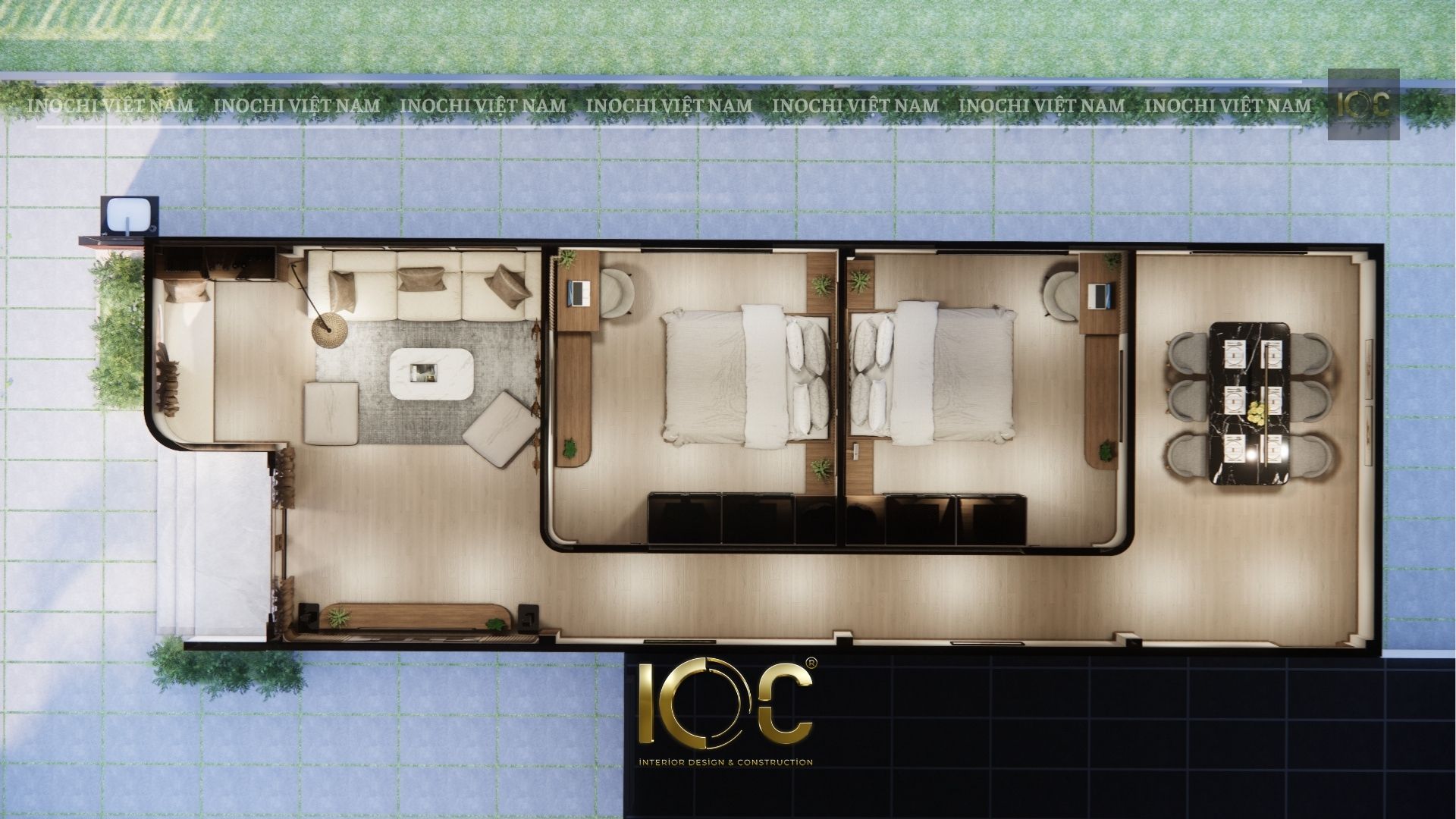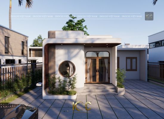 The prefabricated house model with soft design, delicate curved lines creates a difference. Using aerated concrete helps to effectively insulate sound and heat, ensuring a quiet and cool living space. Large glass doors and round windows help optimize natural light, bringing a feeling of openness, close to nature. Fast construction, sustainable materials, cost savings and environmentally friendly.