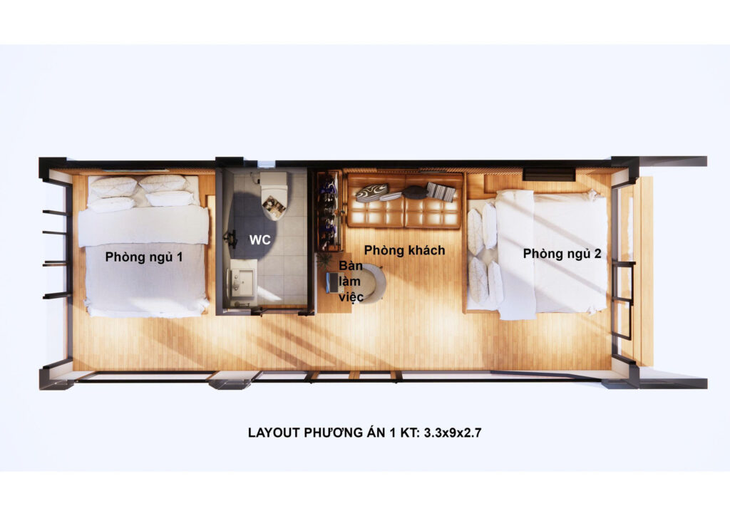 Width 3.3m / Length 9m / Height 2.7mLayout: 2 bedrooms, 1 living room, 1 study/office, and 1 toilet.