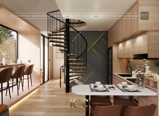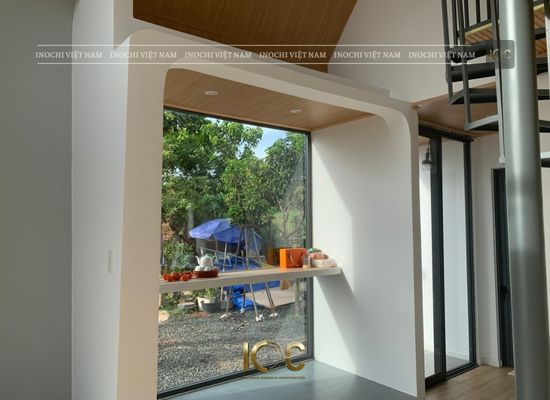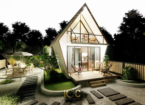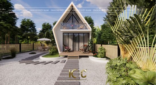 Mẫu nhà mang phong cách thiết kế hiện đại, độc đáo và rất ấn tượng. Với hình dáng mái chéo và các đường nét mềm mại, nó tạo cảm giác sáng tạo, tinh tế và gần gũi với thiên nhiên. Cửa kính lớn ở mặt tiền tạo sự kết nối giữa bên trong và bên ngoài, đồng thời tận dụng ánh sáng tự nhiên, làm cho không gian bên trong nhà trở nên thoáng đãng hơn. Ban công ở tầng trên cũng là một điểm nhấn, tạo thêm không gian thư giãn riêng tư.